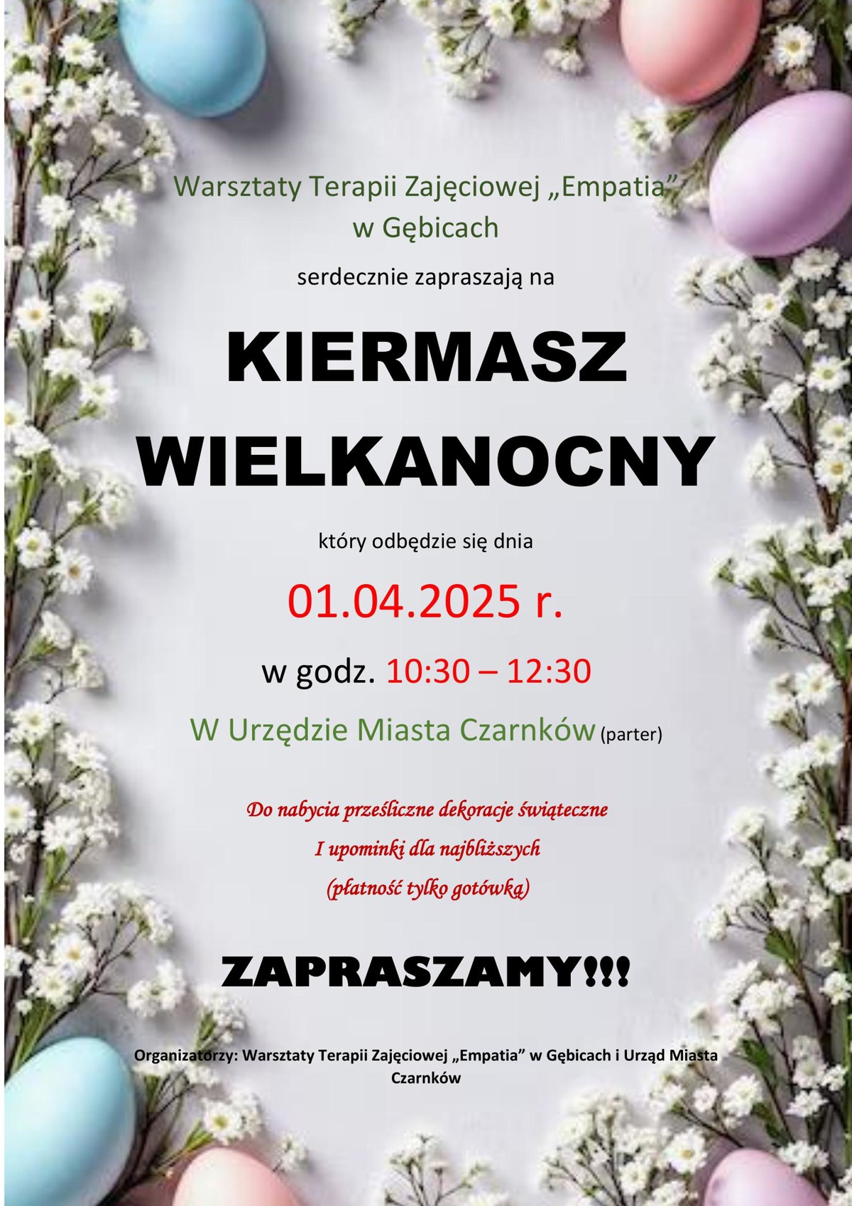 Warsztaty Terapii Zajęciowej „Empatia” w Gębicach oraz Urząd Miasta Czarnków serdecznie zapraszają na Kiermasz Wielkanocny, który odbędzie się 1 kwietnia 2025 roku w godzinach 10:30–12:30 w Urzędzie Miasta Czarnków (parter).