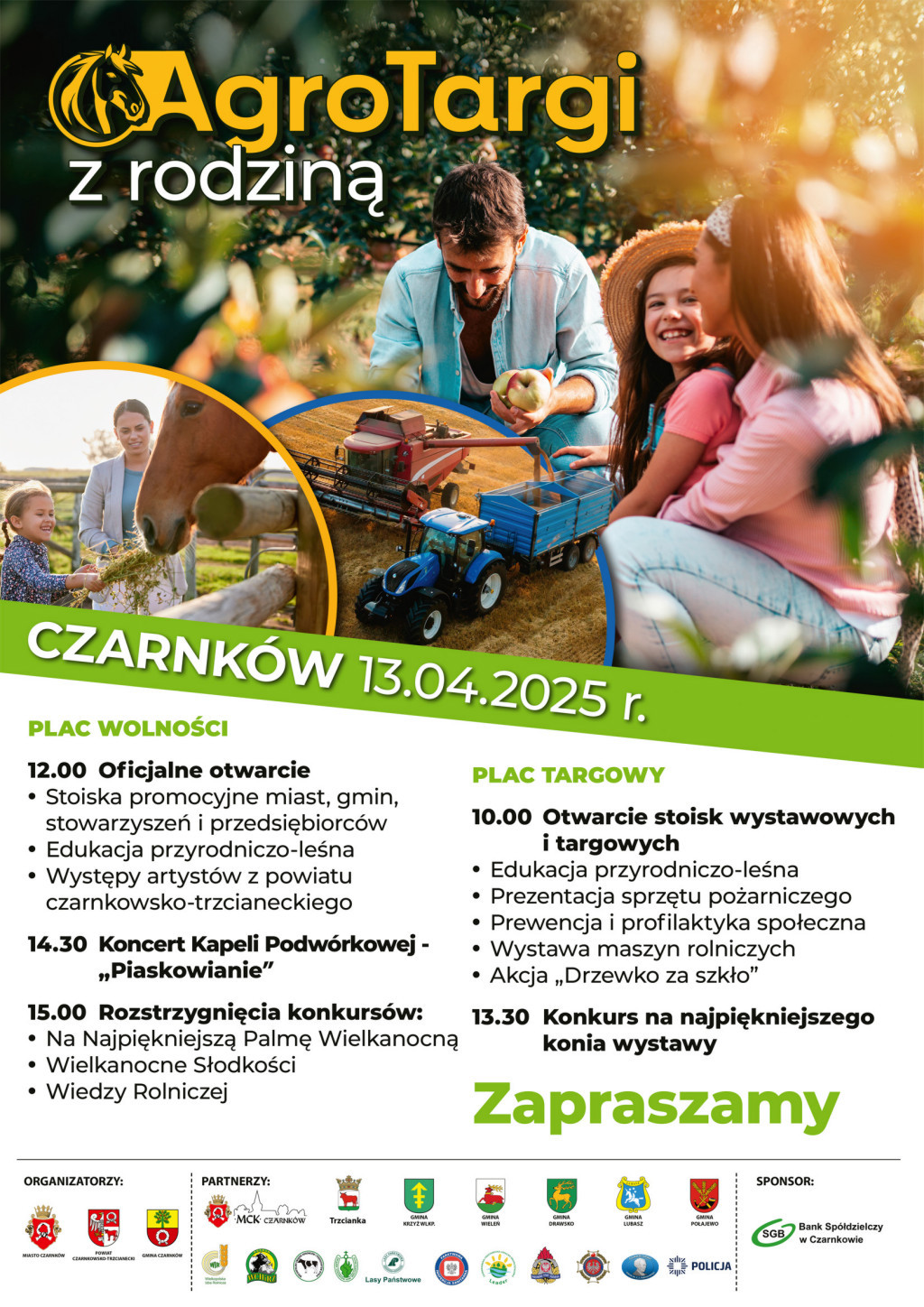 AgroTargi odbędą się w dwóch lokalizacjach. O godzinie dziesiątej na placu targowym nastąpi otwarcie stoisk wystawowych i targowych dotyczących edukacji przyrodniczo – leśnej, sprzętu pożarniczego, prewencji i profilaktyki społecznej, maszyn rolniczych oraz akcji "Drzewko za szkło". O godzinie trzynastej trzydzieści odbędzie się konkurs na najpiękniejszego konia wystawy. Z kolei na Placu Wolności o godzinie dwunastej nastąpi oficjalne otwarcie AgroTargów z uruchomieniem stoisk promocyjnych miast, gmin, stowarzyszeń i przedsiębiorców. Nie zabraknie edukacji przyrodniczo – leśnej i występów artystów z powiatu czarnkowsko – trzcianeckiego. O godzinie czternastej trzydzieści wystąpi kapela podwórkowa "Piaskowianie", a pół godziny później nastąpi rozstrzygnięcie konkursów na Najpiękniejszą Palmę Wielkanocną, Wielkanocne Słodkości oraz Wiedzy Rolniczej.