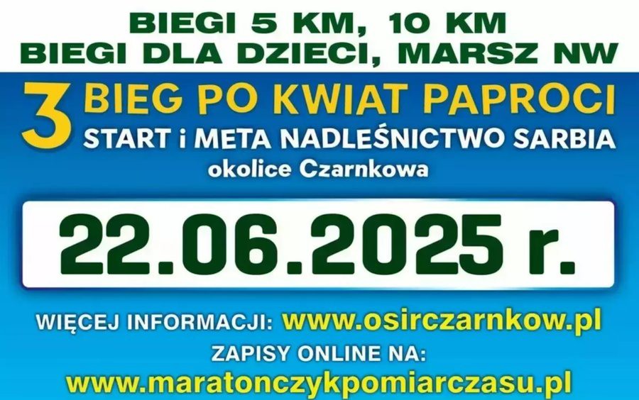 Już 22 czerwca 2025 r. odbędzie się trzecia edycja Biegu Po Kwiat Paproci. To wyjątkowe wydarzenie sportowe organizowane w malowniczej scenerii leśnej z trasami na 5 km i 10 km, biegami dla dzieci oraz marszem Nordic Walking.